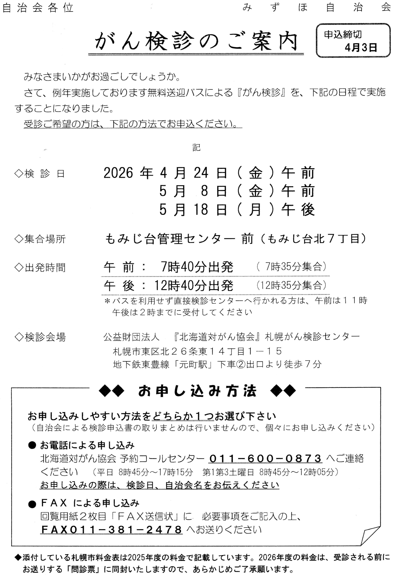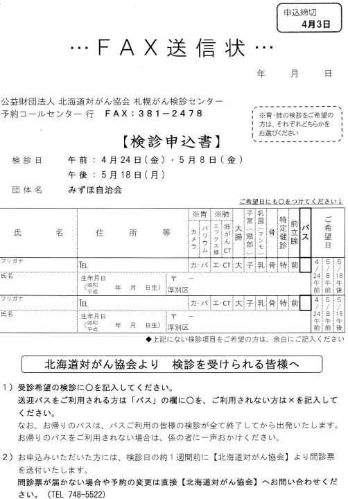 今回は自治会による取りまとめは行わないので、受診希望者は個々に別紙のとおり直接「北海道対がん協会」へ申込んで下さい。